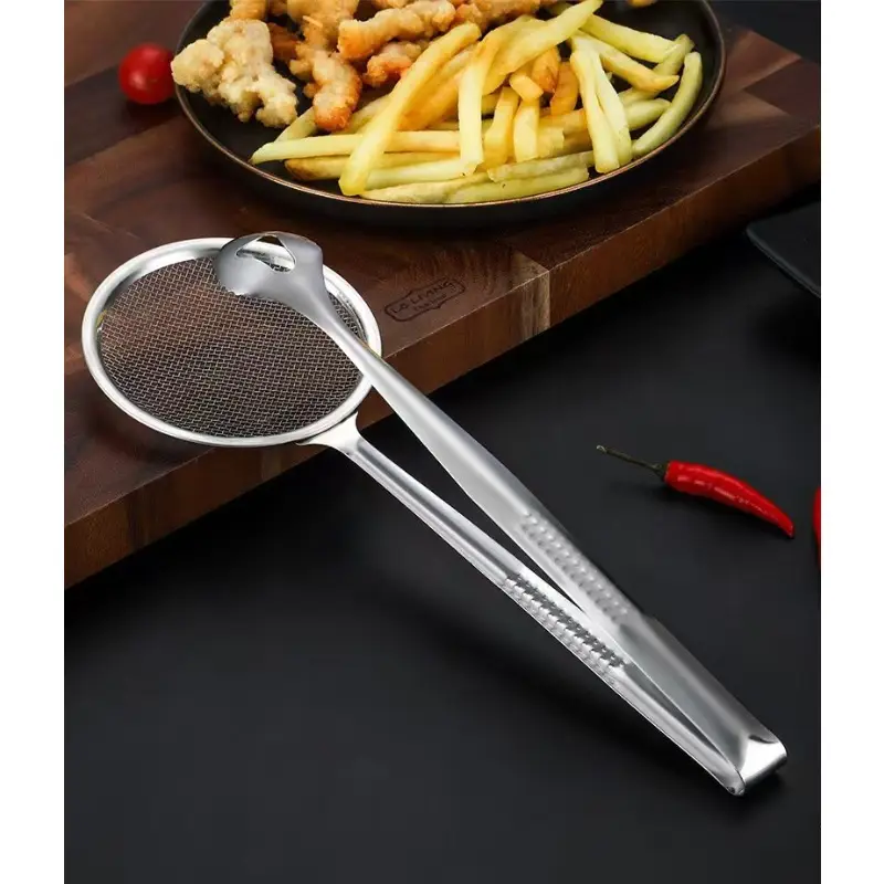Combinación perfecta de cuchara de malla fina y pinzas, colador asiático de acero inoxidable con un clip/abrazadera puede evitar que la comida se caiga. Fácil manejo y colgar.