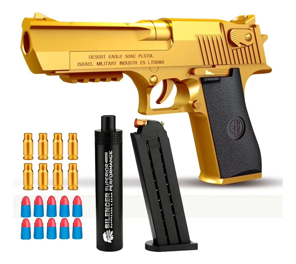 La pistola Glock Dorada de balas blandas *************************** LA COMPRA INCLUYE • 1 Pistola Golden Bala Suave Color dorada • 10 Balas Blandas • 8 Casquillos * 1 Silenciador. ************************* este juguete está hecho de plástico de alta calidad, sólido y duradero. Bala de forma suave, segura sin daño al cuerpo humano. ********************** Diseño auténtico: el diseño de expulsión de carcasa vacía y tira hacia atrás hace que los juguetes de pistola sean más reales e interesantes. ********************* Elección de regalo perfecta: adecuado para niños de más de 8 años, vacaciones, Navidad y regalos de cumpleaños. ********************