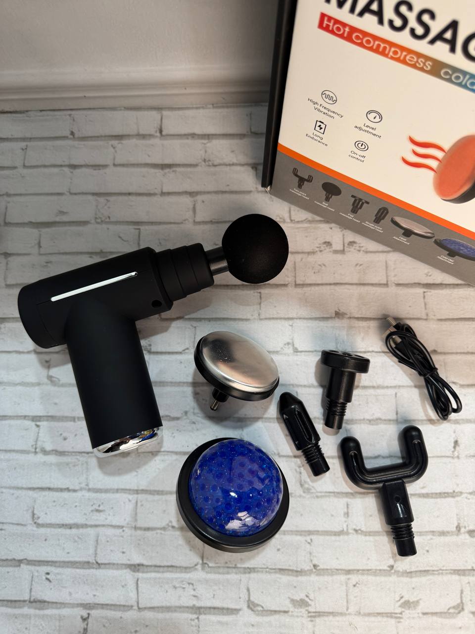 Dispositivo eléctrico portátil diseñado para proporcionar masaje de percusión profunda, ayudando a aliviar la tensión muscular, mejorar la circulación sanguínea y acelerar la recuperación después de la actividad física. Incluye múltiples cabezales intercambiables para diferentes zonas del cuerpo.