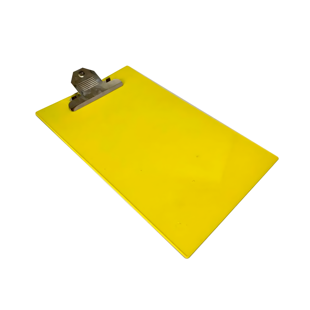 Planillero plástico tamaño oficio con gancho metálico, diseñado para mayor capacidad de hojas. Su color amarillo facilita identificación rápida en entornos organizados.