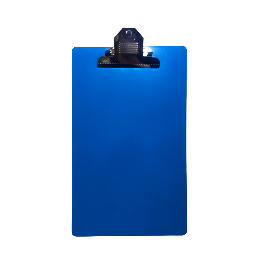 Soporte plástico tamaño oficio con gancho metálico reforzado para sujeción segura de documentos. Su color azul facilita identificación visual en oficina.