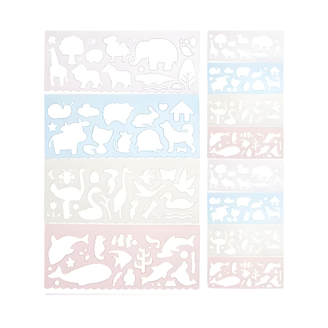 Plantilla plástica con figuras de animales para dibujo guiado y actividades pedagógicas. Facilita trazos uniformes y proporciones básicas en ilustraciones infantiles.
