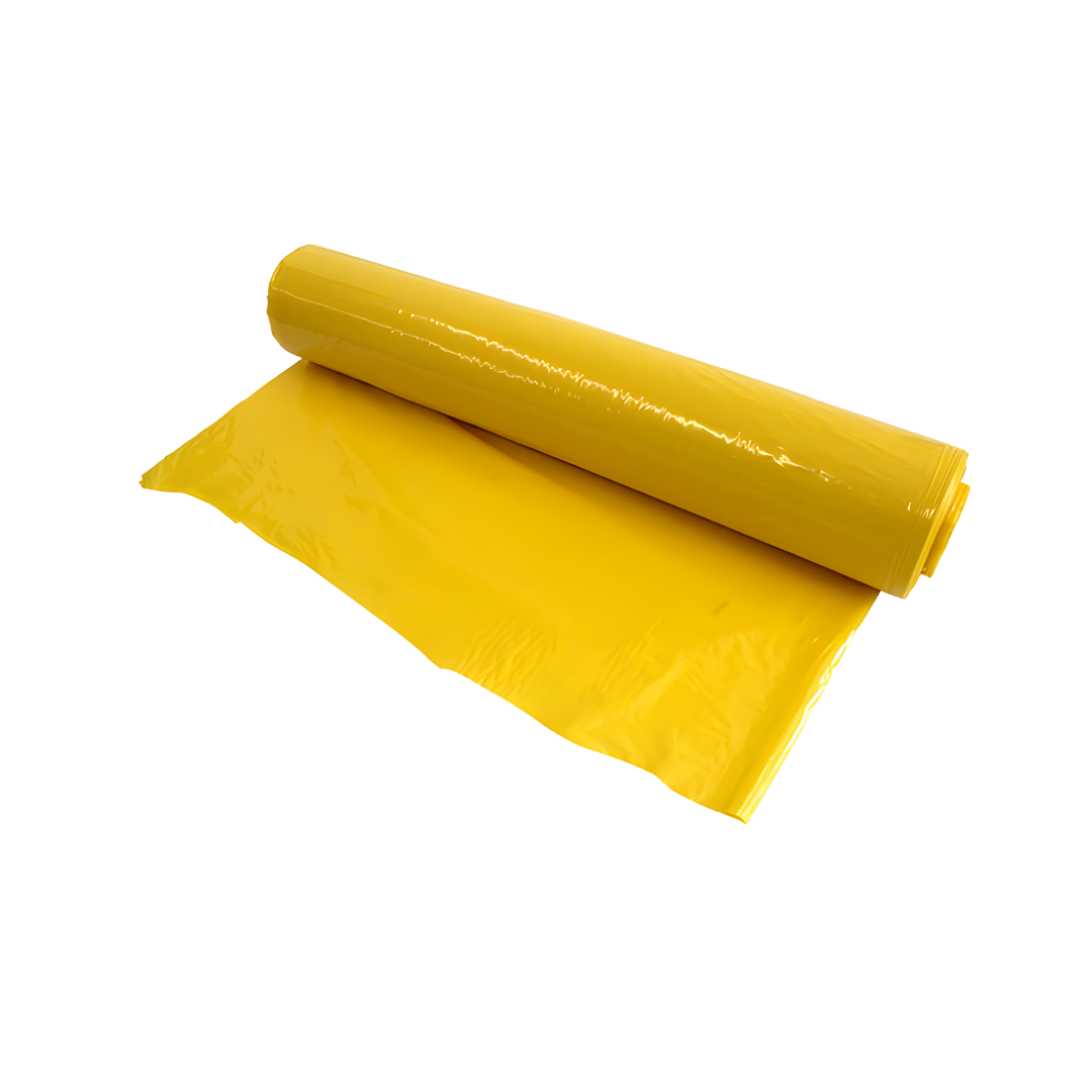 Rollos plásticos de 5 metros en color amarillo, útil para cubrir superficies o realizar decoraciones y manualidades.