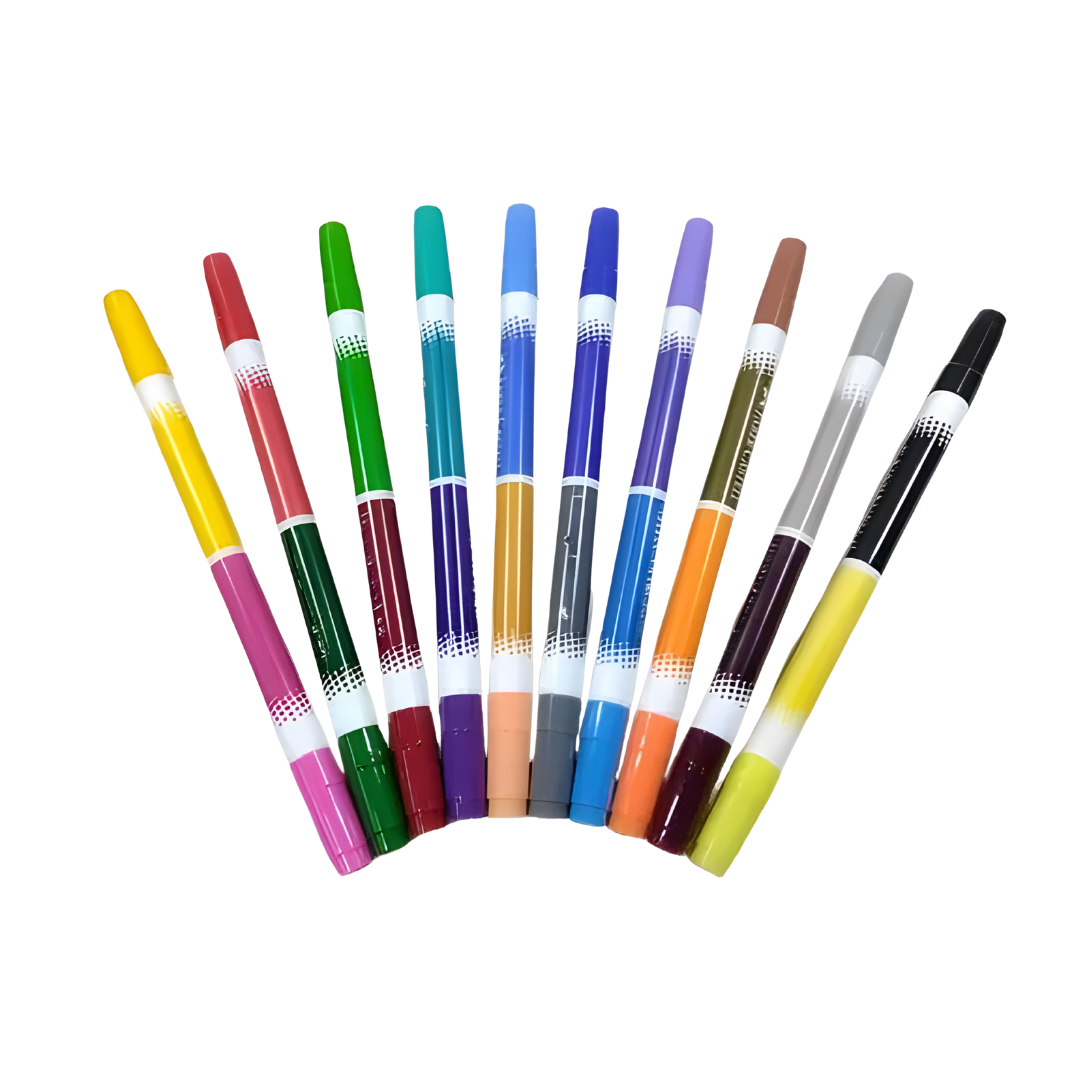 Este set de plumones bicolor ofrece versatilidad al contar con doble tonalidad en cada unidad, permitiendo realizar trazos variados y combinaciones creativas.