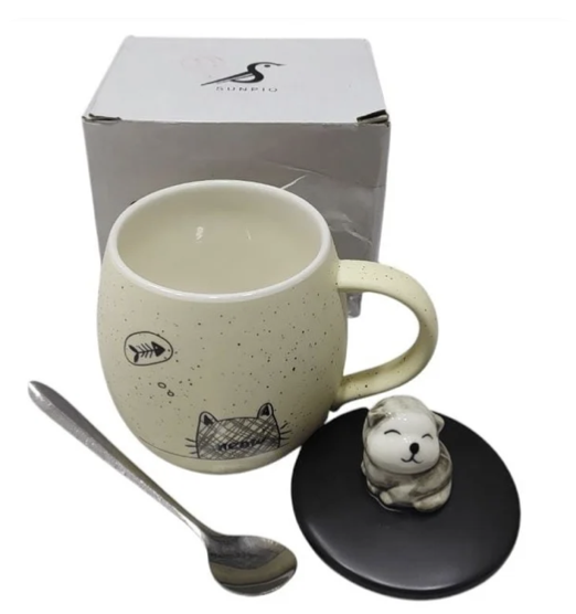 Taza decorativa con tapa y cuchara, diseñada con un estilo moderno y divertido. Incluye una tapa con figura decorativa que ayuda a mantener la temperatura de la bebida por más tiempo y una cuchara metálica ideal para mezclar café, té o chocolate. Es perfecta para uso diario en casa, oficina o como un bonito regalo.