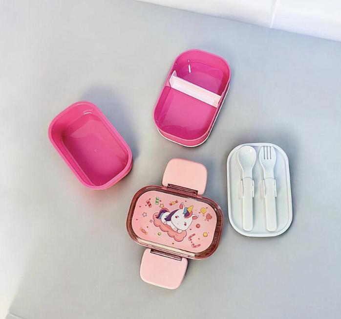 Portacomida infantil de dos niveles con tres divisiones internas y diseño temático de dinosaurio, astronauta y unicornio, pensada para facilitar la organización y transporte de alimentos para niños. Ideal para llevar almuerzos, snacks y comidas completas de forma ordenada y atractiva. Incluye cubiertos para mayor comodidad.