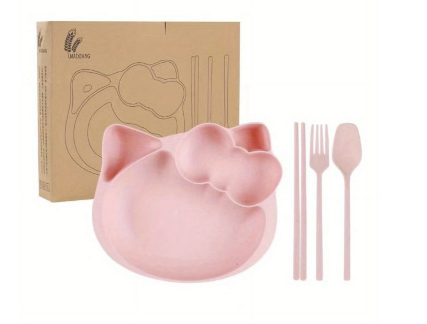 Plato infantil con diseño adorable tipo caricatura (estilo gatita con moño), ideal para hacer más divertida la hora de la comida. Incluye cubiertos a juego (tenedor y cuchara), especialmente diseñados para niños pequeños. Perfecto para uso diario en casa.