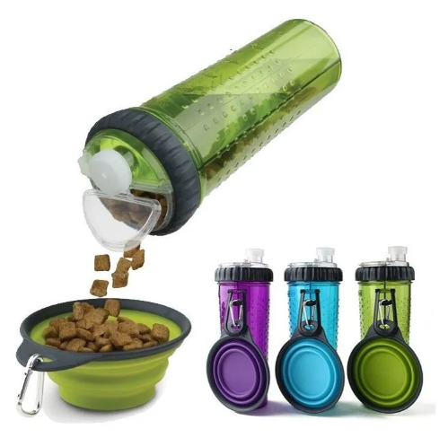 Su diseño de botella dual permite almacenar agua y comida en compartimientos separados, ofreciendo una solución práctica para transportar todo lo que tu mascota necesita en un solo recipiente. Además, incluye un tazón plegable que se adhiere fácilmente al envase, lo que facilita servir agua o alimento en cualquier momento.