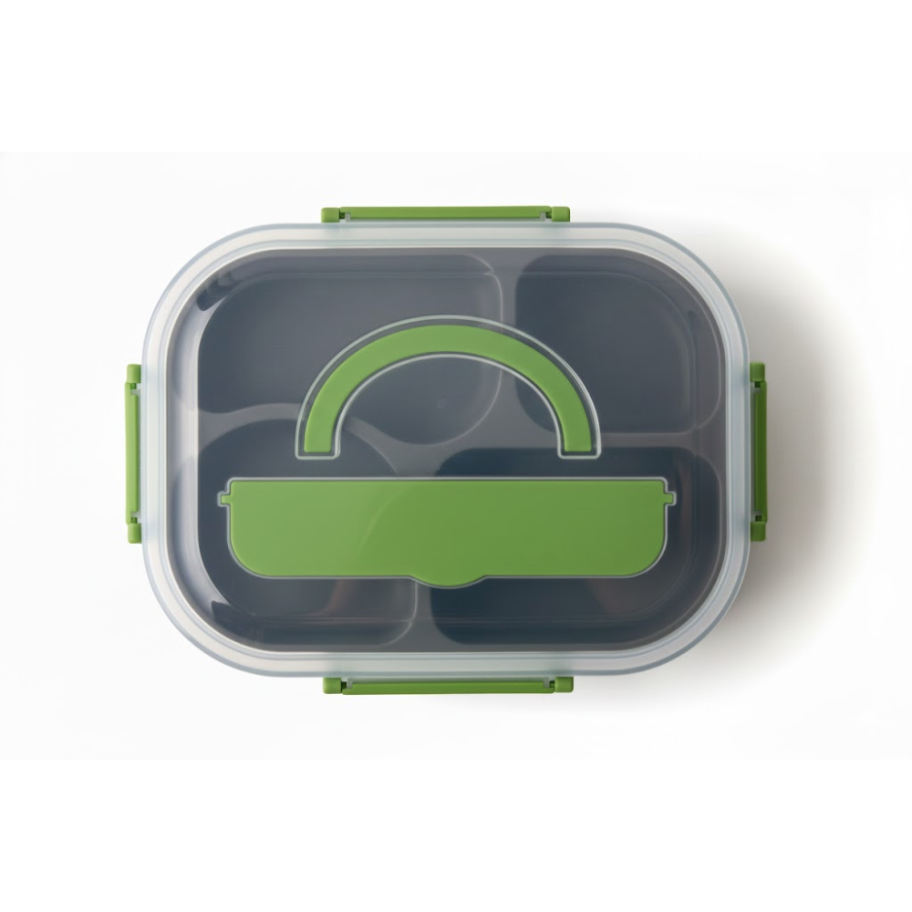 En el interior se aprecian varios compartimentos que facilitan separar diferentes tipos de alimentos, manteniendolos frescos y evitando que se mezclen. Esta distribucion interna lo convierte en una solucion ideal para quienes buscan practicidad en sus rutinas diarias, ya sea en el trabajo, en la escuela o en actividades al aire libre. La tapa incluye un diseño decorativo que aporta un toque distintivo y moderno.