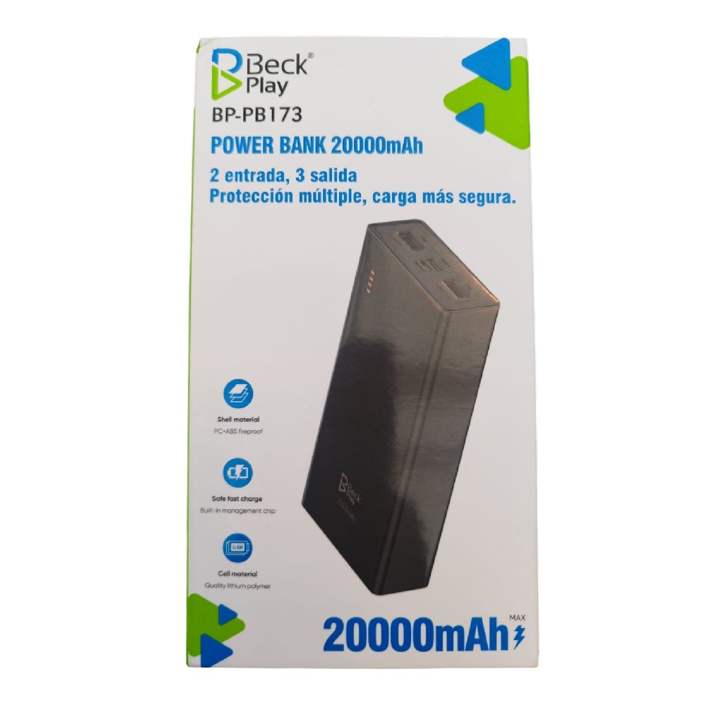Ponemos a su disposición la Batería Externa de Alta Capacidad 20000mAh (Power Bank), referencia (Beck Play). Este es un accesorio de electrónica de consumo esencial, con una capacidad que satisface las necesidades de carga múltiple y prolongada de los usuarios actuales. Es un producto de alta demanda y excelente rentabilidad.