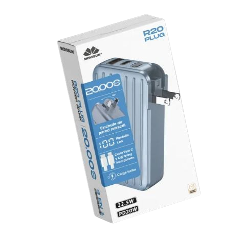 El Powerbank Movisun R20 Plug es la solución ideal para quienes buscan energía portátil y confiable. Con una capacidad de 20 Ah, este cargador garantiza que tus dispositivos móviles estén siempre listos para usar, sin importar dónde te encuentres. Su diseño compacto y ligero lo hace perfecto para llevar en el bolso o mochila, asegurando que nunca te quedes sin batería.