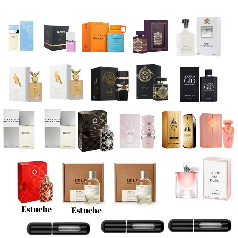 20 PERFUMES LIGTH BLE DAMA ,ILIMIN ROSO ESTUCHE ,MANDARIN SKY ,LATAFFA MORADA ,SILVER ,2 SHAHEEN GOLD ESTUCHE ,ASAD , INITIO ESTUCHE ,GIO PROFONDO ,2 ISSY MEN ,ORIENTICA NEGRA ,YARA ,OEN MILLION ELIXIR ,HAYA ,ORIENTICA ROJA ESTUCHE ,2 SANTAL 33 ,VIDA BELLA ,MAS 3 PERFUMEROS RECARGABLES
