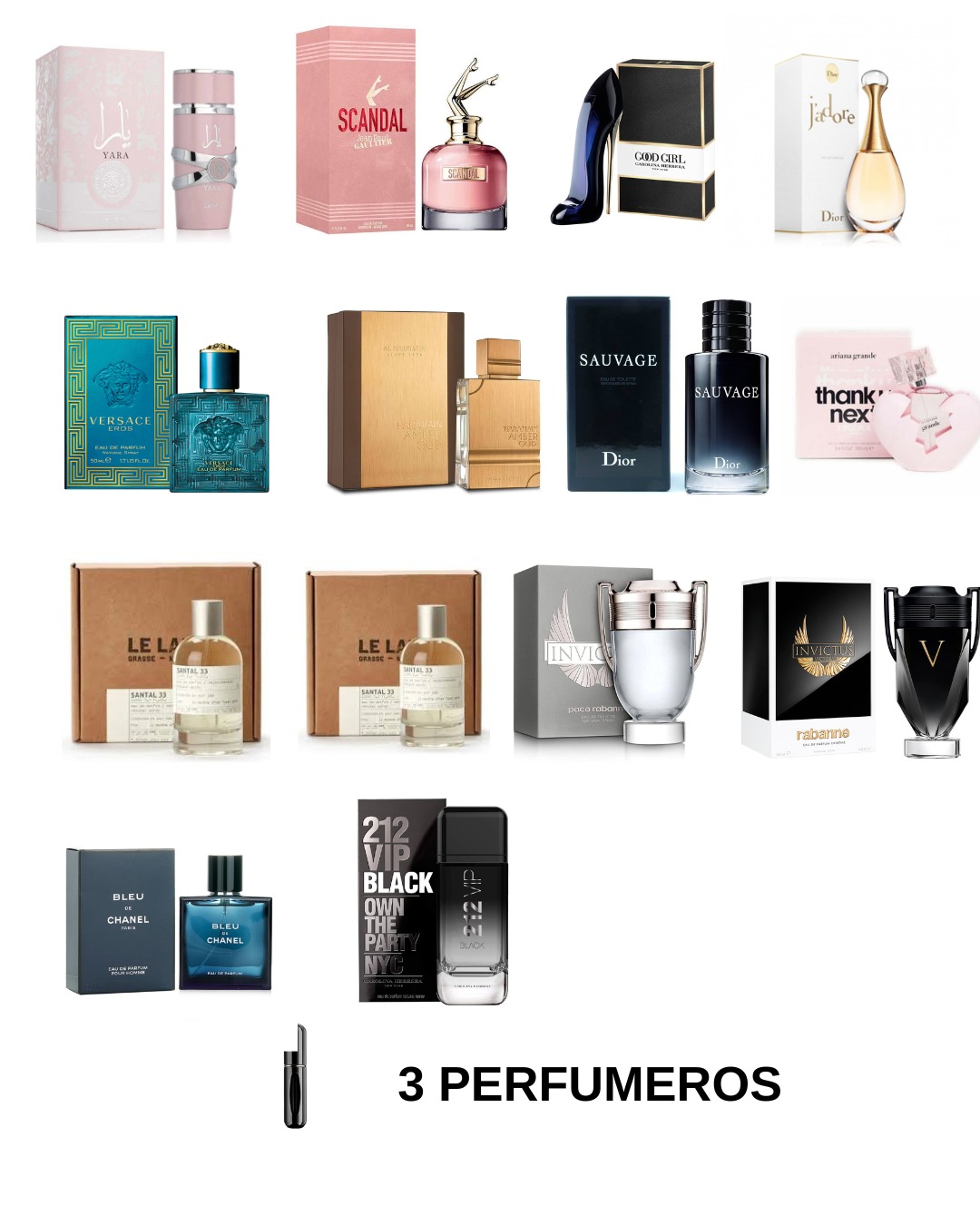 14 PERFUMES YARA,SACANDAL DAMA ,GOOD GIRL ,JADORE ,EROS ,AL HARAMAIN ,SAUVAGE ,THANK U NEXT ,2 SANTAL 33 ,INVICTUS ,INVICTUS VICTORY ,BLEU ,212 BLACK ,MAS 3 PERFUMEROS RECARGABLES