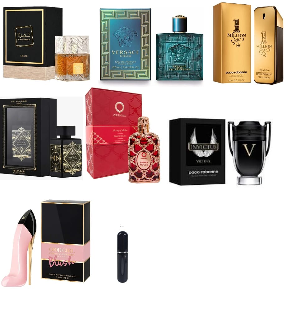 7 PERFUMES KHAMRA ,EROS,ONE MILLION ,LATAFFA NEGRA ,ORIENTICA ROJA ,INVICTUS VICTORY ,GOOD GIRL BLUCHS , MAS UN PERFUMERO RECARGABLE