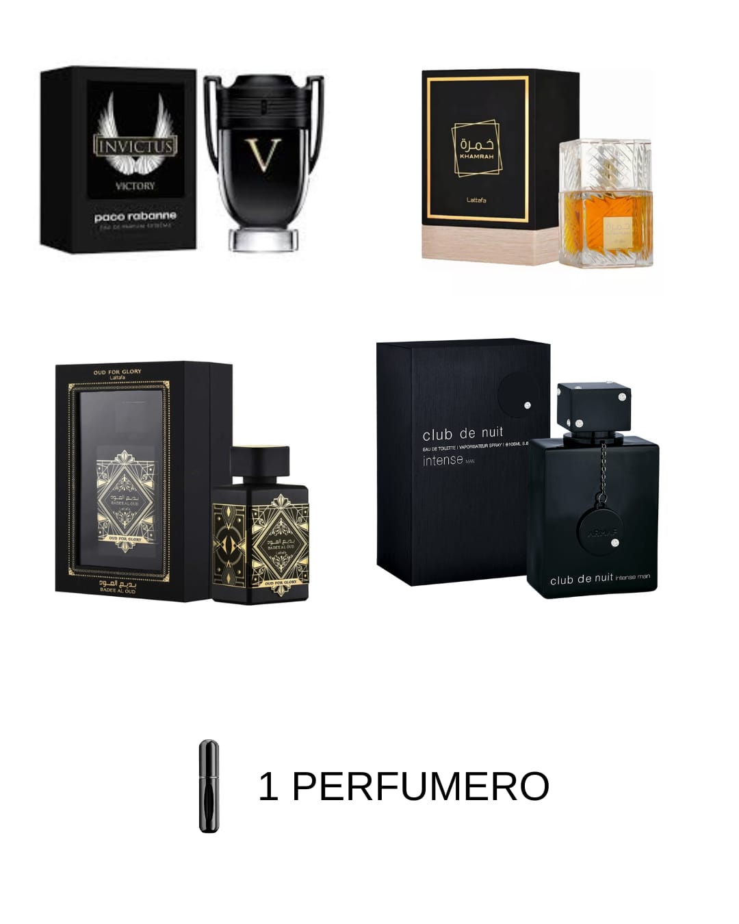 4 PERFUMES INVICTUS VICTORY ,KHAMRA ,LATAFFA NEGRA ,CLUB THE NUIT , MAS UN PERFUMERO RECARGABLE