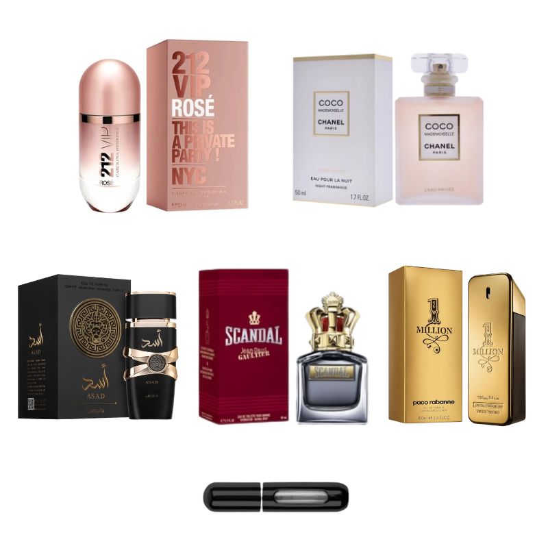5 PERFUMES 212 ROSE ,COCO ,ASAD ,SCANDAL MEN ,ONE MILLION ,MAS UN PERFUMERO RECARGABLE