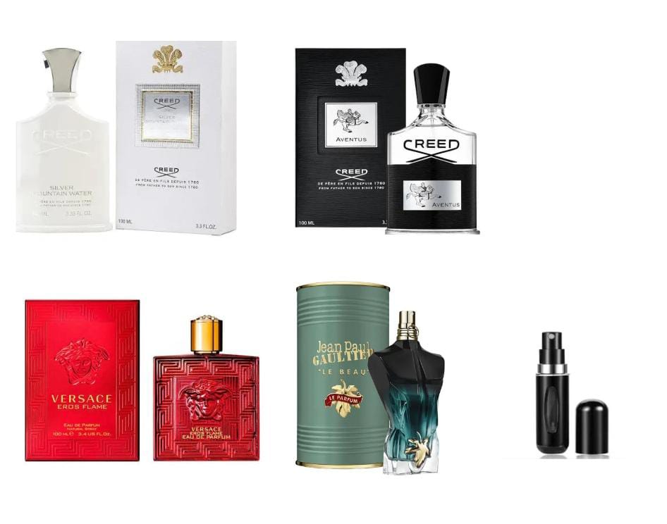 4 PERFUMES SILVER ,AVENTUS ,EROS FLAME ,JEAN PAUL LE BEAU PARFUM LATA , MAS UN PERFUMERO RECARGABLE