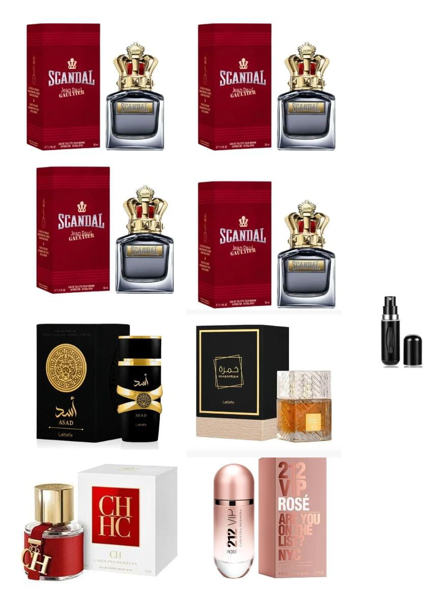 8 PERFUMES 4 SCANDAL MEN ,ASAD , KHMARA ,CH DAMA ,212 ROSE , MAS UN PERFUMERO RECARGABLE