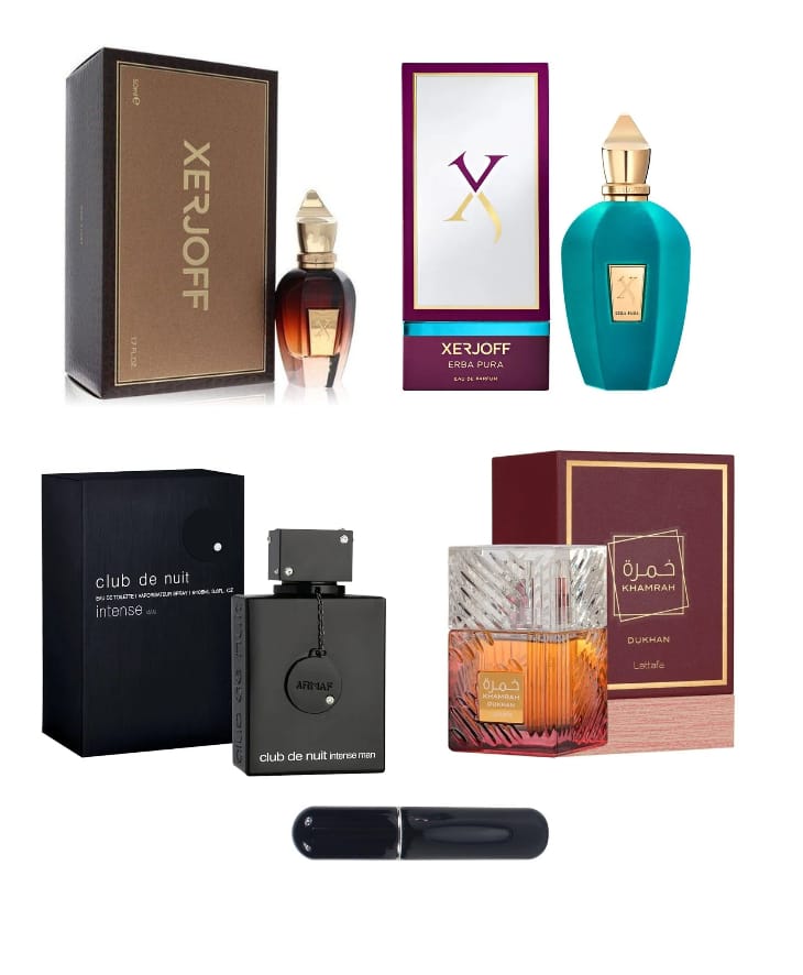 4 PERFUMES XERJOOF ALEXANDRIA ,ERBA PURA ,CLUB THE NUIT ,KHAMRA DUKHAN MAS UN PERFUMERO RECARGABLE