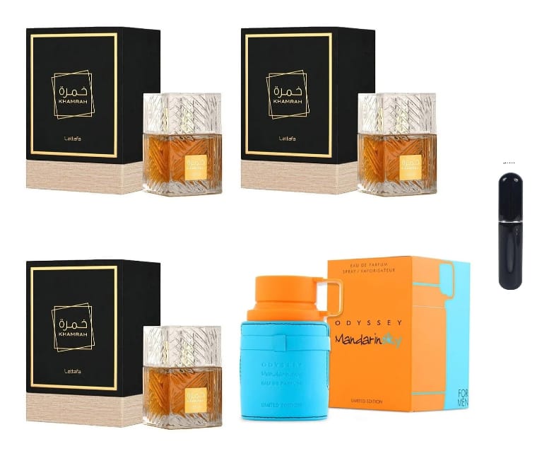 4 PERFUMES 3 KHAMRA ,MANDARIN SKY ,MAS UN PERFUMERO RECARGABLE