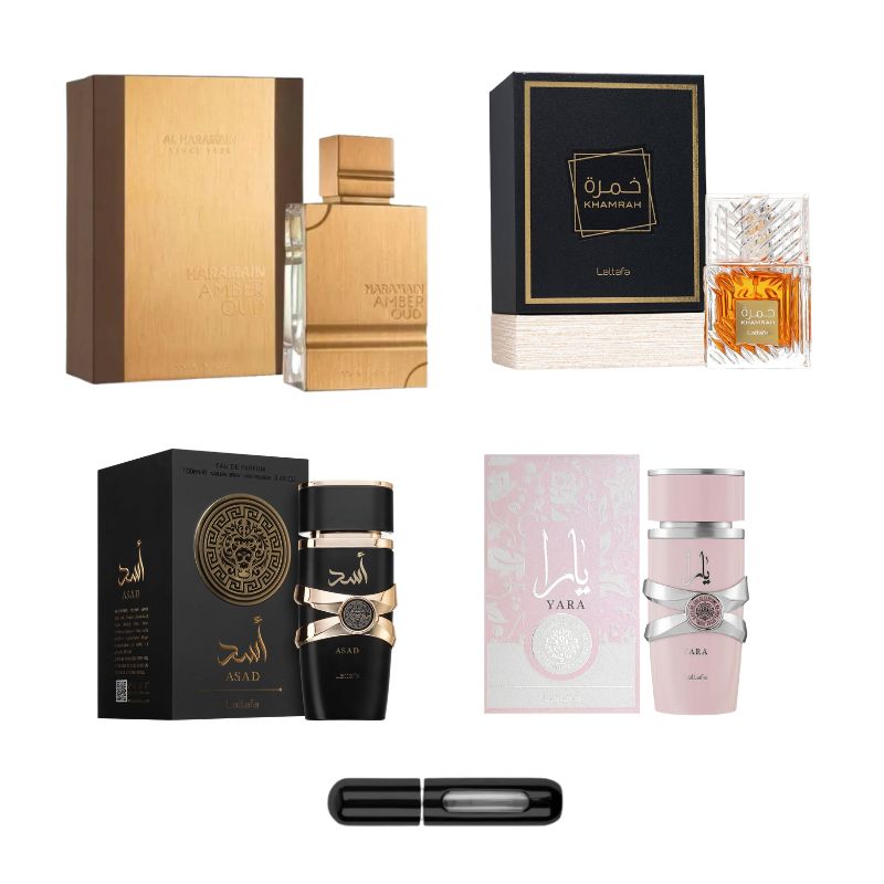 4 PERFUMES AL HARAMAIN ,KHAMRA ,ASAD ,YARA ,MAS UN PERFUMERO RECARGABLE