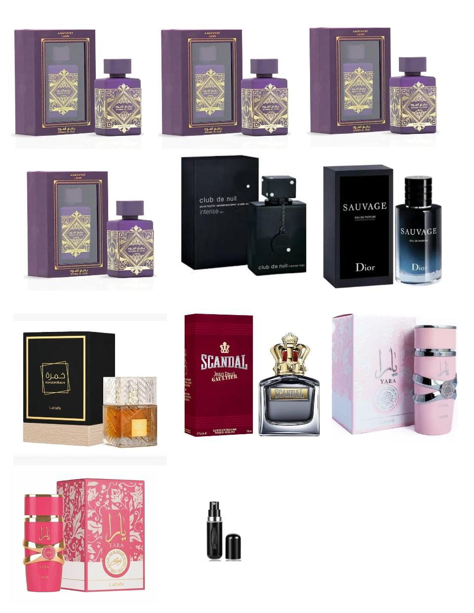 10 PERFUMES 4 LATAFFA MORADA ,CLUB THE NUIT ,SAUVAGE ,KHAMRA ,SCANDAL MEN ,YARA ,YARA CANDY , MAS UN PERFUMERO RECARGABLE