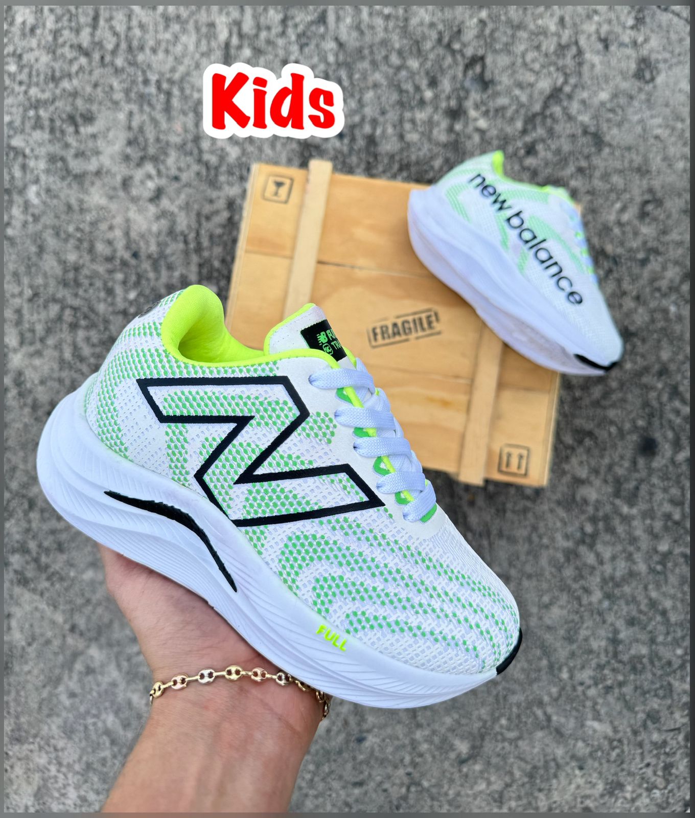 Tenis New Balance para niños: diseño deportivo, cómodos y ligeros. Disponibles en blanco/negro, verde neón, negro y naranja vibrante. Ideales para el diario