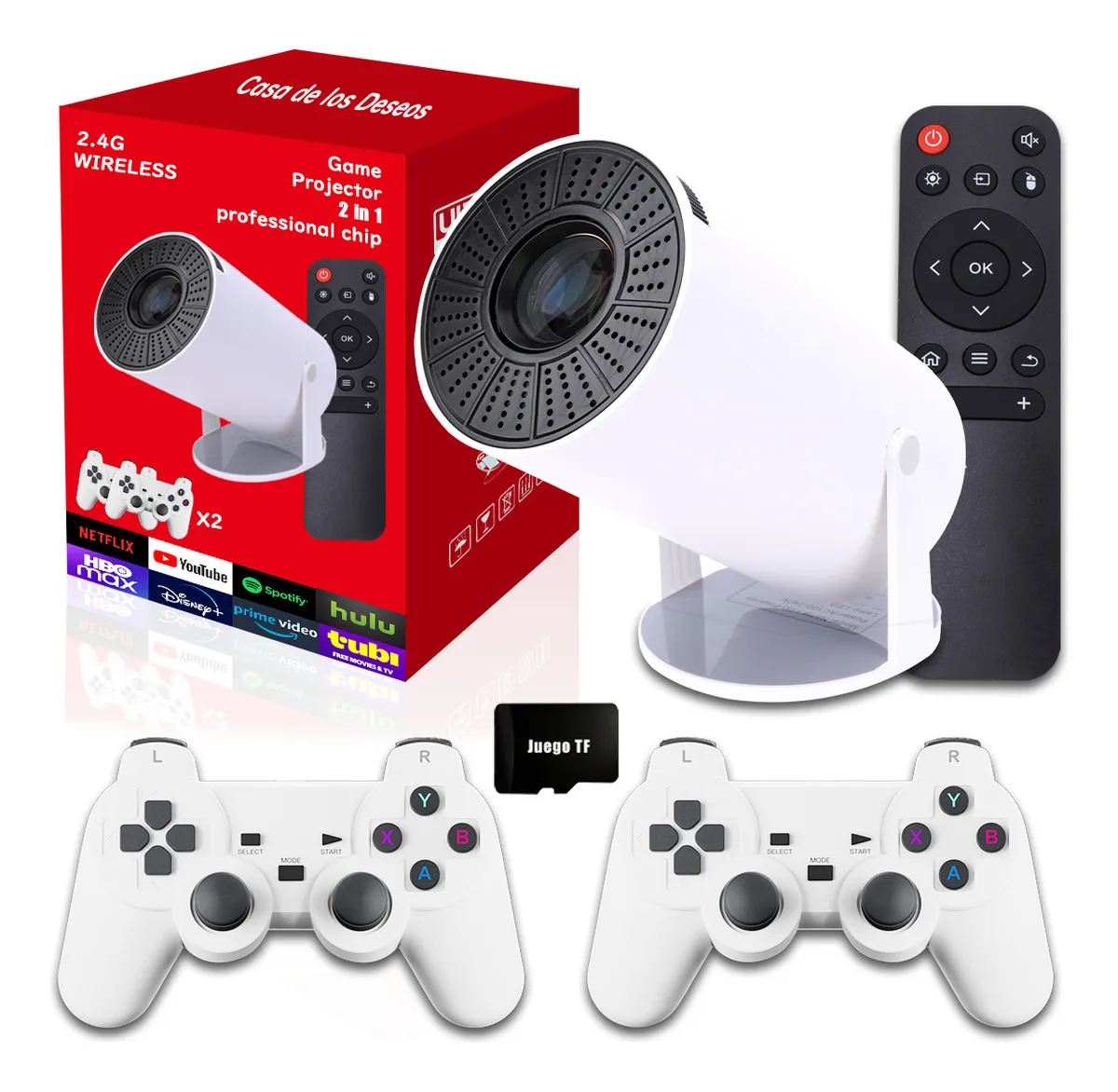 proyector portatil mini, Proyector Android para Juegos , proyector 4k, proyector led, proyector profesional, proyector para celular, proyector barato, proyector smart tv Sistema Android 12, 2GB RAM y 16GB ROM Funciona con el moderno sistema Android 12, lo que le otorga una gran fluidez y facilidad de uso. Con 2 GB de RAM y 16 GB de ROM, no solo puede ejecutar el sistema de manera eficiente, sino que también permite la instalación libre de una amplia variedad de aplicaciones. Ya sea que desee descargar juegos adicionales, aplicaciones de entretenimiento o herramientas de productividad, tendrá suficiente espacio y capacidad para hacerlo. Esto significa que puede personalizar completamente su experiencia de proyección según sus necesidades y preferencias. Gran Colección de Juegos y Mandos Compatibles Uno de los aspectos más impresionantes de este proyector es que incorpora más de 20000 juegos de 21 series diferentes. Ya sea que sea un amante de los juegos clásicos, los juegos de acción, los juegos de estrategia o cualquier otro género, seguramente encontrará algo que le guste. Y para mejorar la experiencia de juego, viene con dos mandos de juegos. Estos mandos no sólo sirven para jugar con proyectores, sino también para juegos de ordenador STEAM y PC. Esto significa que puede usar los mismos mandos para disfrutar de juegos en diferentes plataformas, lo que brinda una gran conveniencia y versatilidad. Calidad de Proyección Excelente Ofrece una impresionante resolución 1080P de alta definición, lo que garantiza imágenes nítidas y detalladas. Con una luminosidad de 12000 lm, la imagen proyectada es brillante y colorida. Ya sea que esté viendo una película, un vídeo o jugando a un juego, la calidad visual será simplemente asombrosa. Y el tamaño de la pantalla de proyección puede ajustarse entre 50 y 150 pulgadas, dependiendo de la distancia y la preferencia del usuario. Esto significa que puede disfrutar de una gran pantalla cinematográfica en la comodidad de su hogar o adaptar el tamaño de la pantalla para una presentación más pequeña en una reunión de oficina.