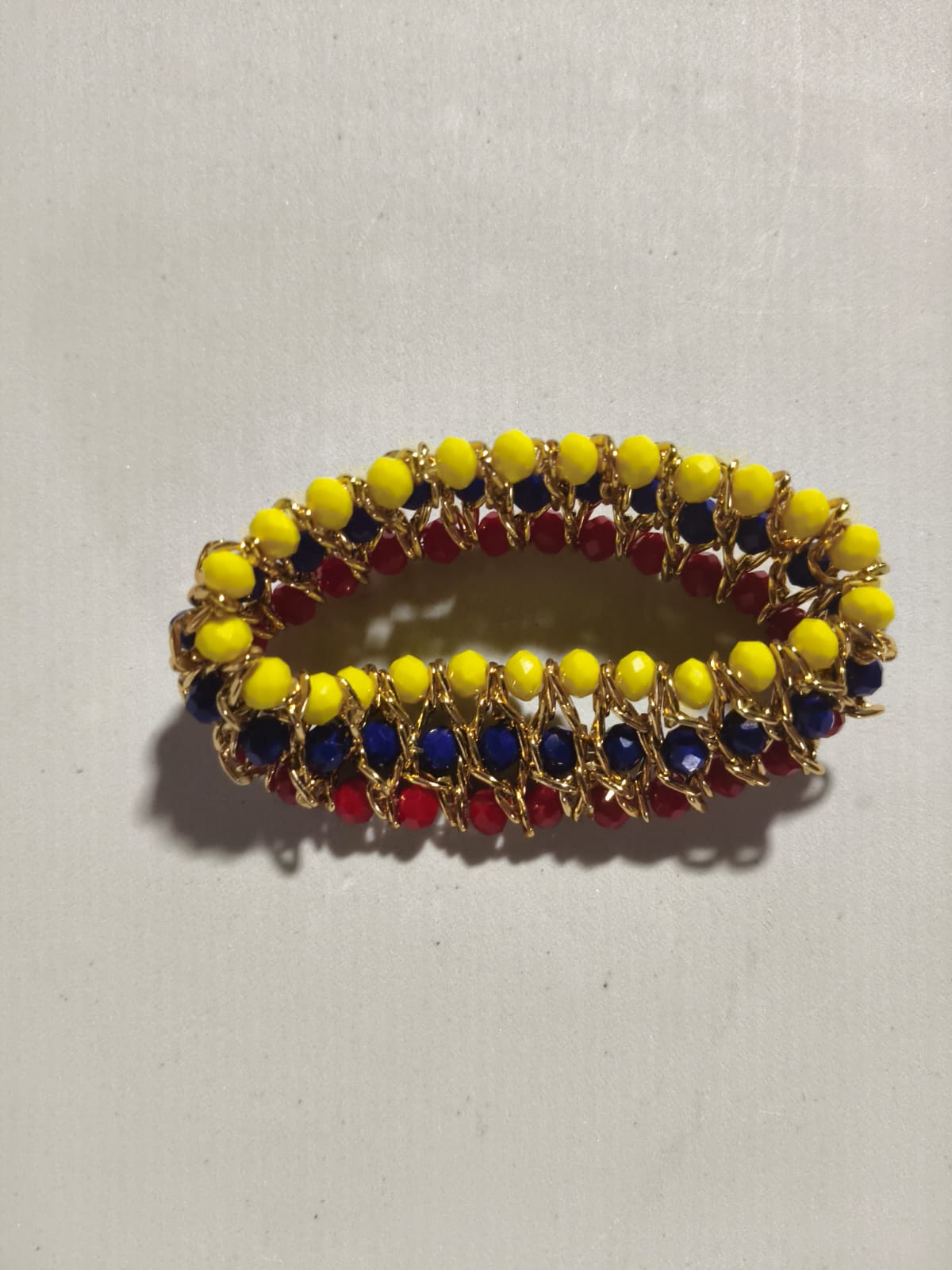 Luce un estilo elegante y lleno de color con esta hermosa pulsera para dama, diseñada con cadena en oro laminado y decorada con piedras sintéticas en tonos amarillo, azul y rojo que resaltan cualquier look.
