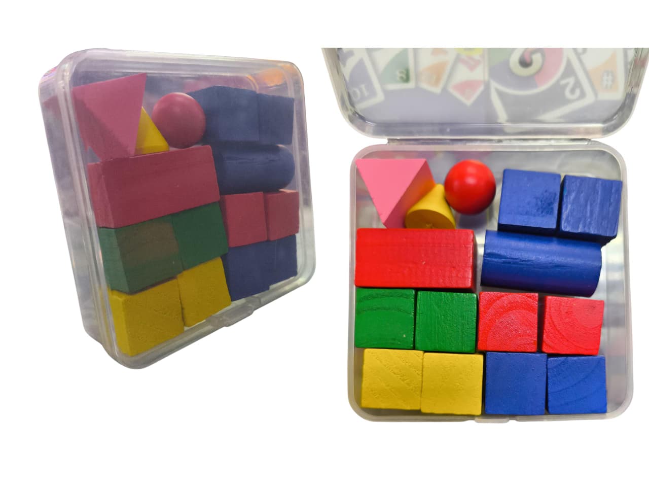 - Los bloques se guardan en una caja de plástico transparente con tapa.