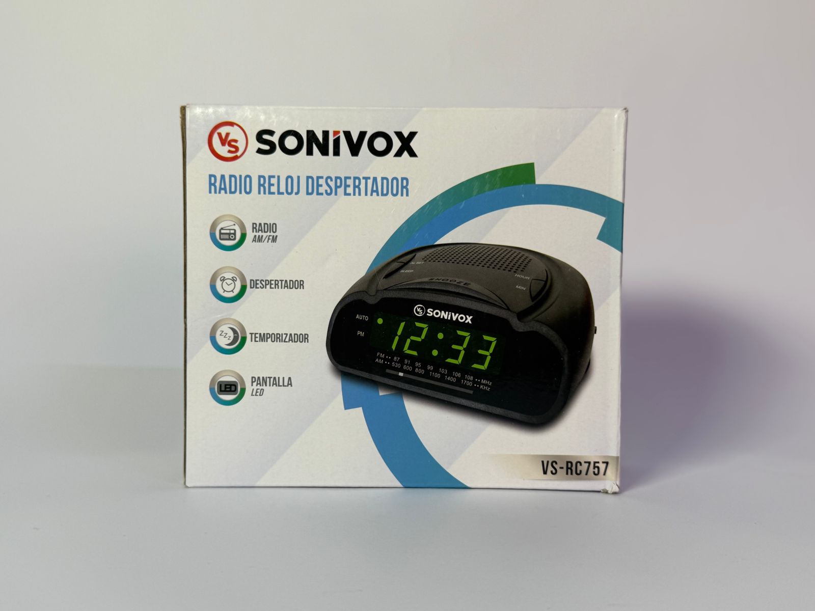 El producto mostrado es un radio reloj despertador de la marca SONIVOX, modelo VS-RC757. Se presenta en una caja de cartón con diseño predominante en color blanco, acompañada de detalles gráficos en tonos azul y verde. En la parte frontal del empaque aparece el logotipo de la marca en la esquina superior izquierda, seguido del nombre “RADIO RELOJ DESPERTADOR” en letras grandes de color azul. También se incluyen iconos descriptivos que destacan sus funciones principales: radio AM/FM, despertador, temporizador y pantalla LED.