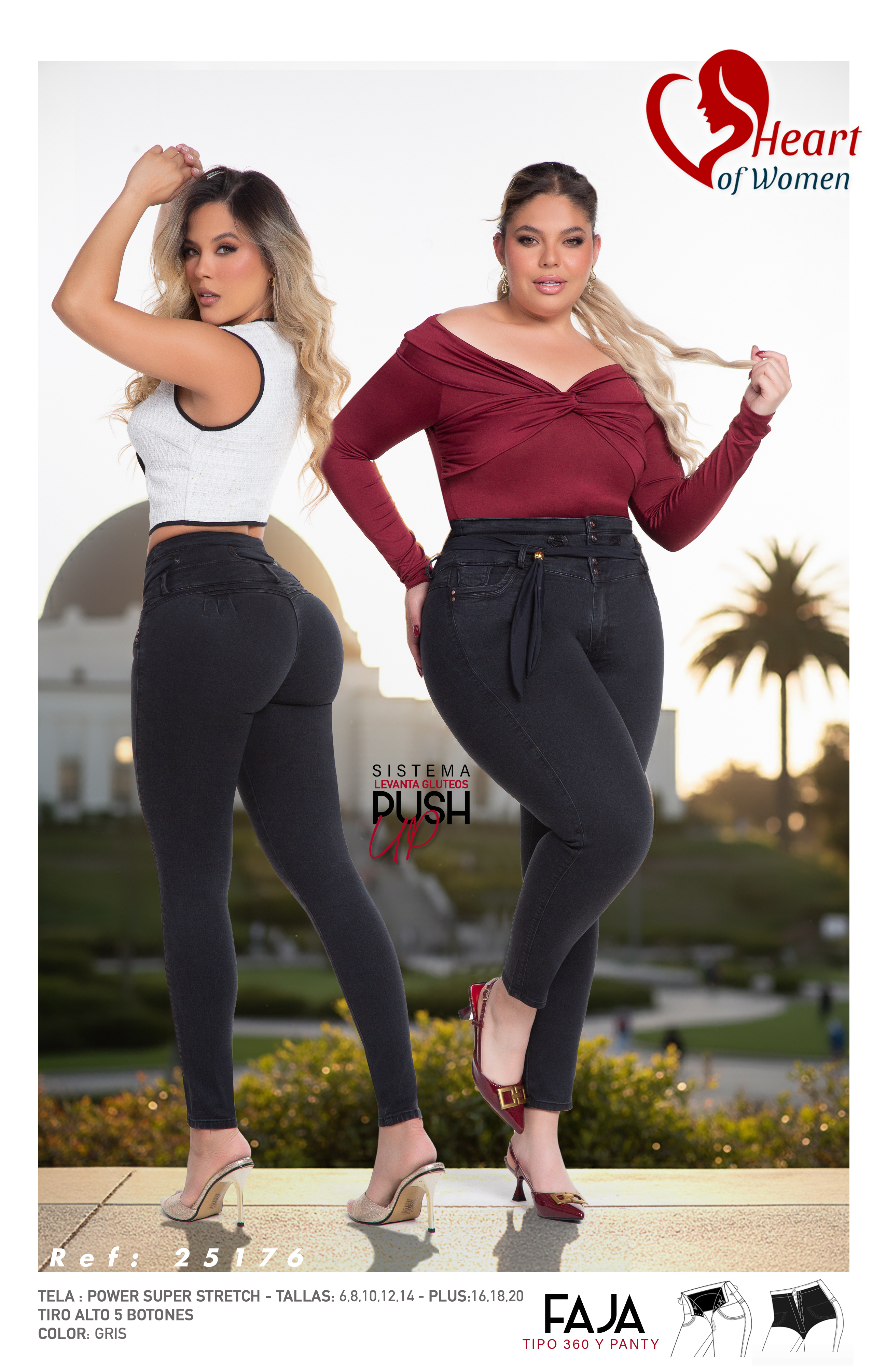 JEAN TIRO ALTO 5 BOTONES, CON FAJA 360° Y TIPOS PANTY, PUSH UP EN TONO GRIS.