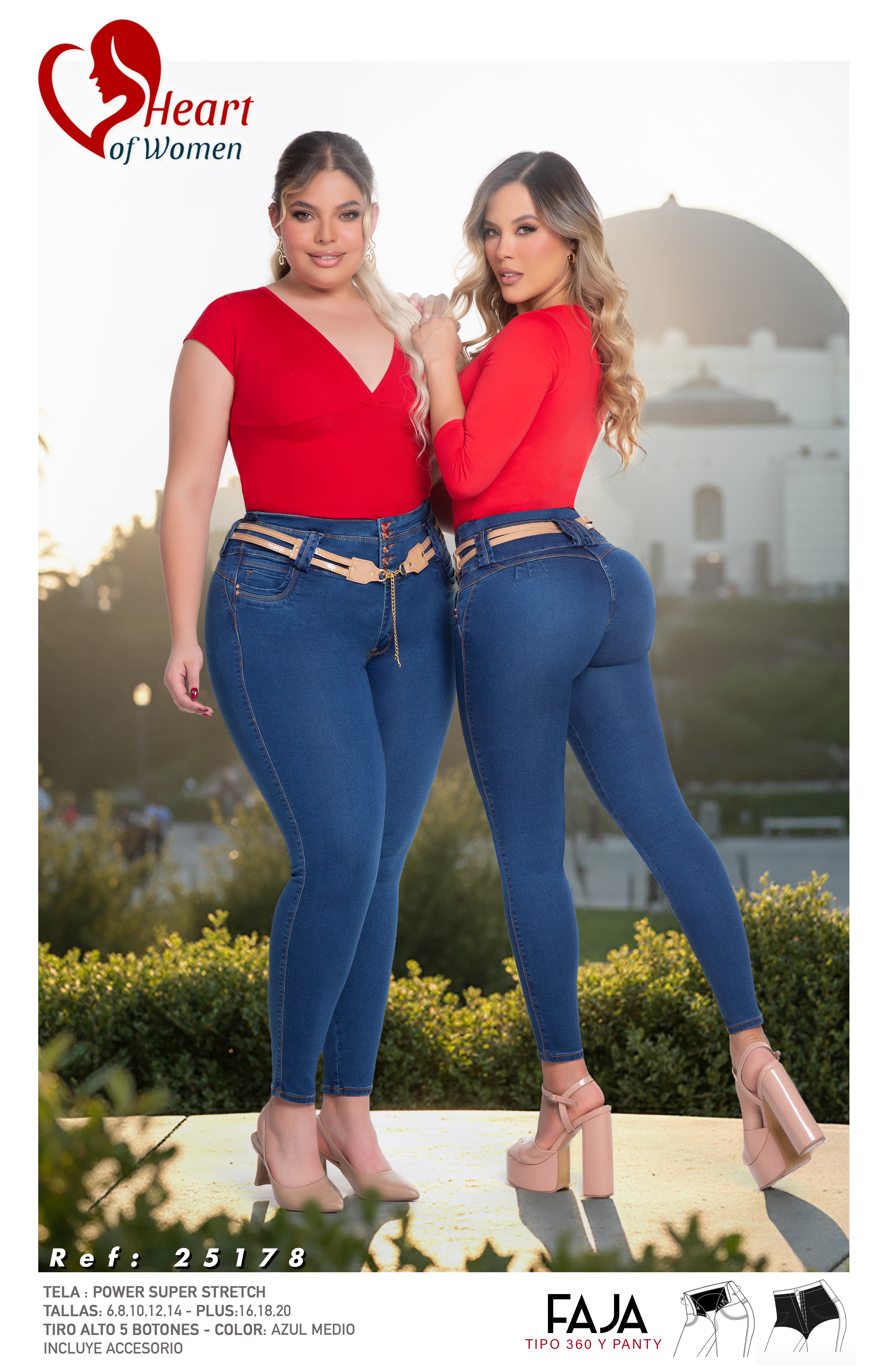JEAN TIRO ALTO 5 BOTONES, CON FAJA INTERNA 360° Y FAJA PANTY, CON PUSH UP TONO AZUL