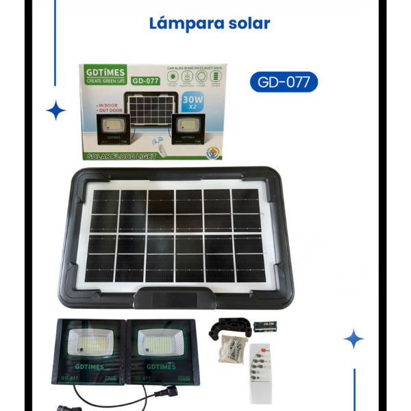 El modelo GD-077 es un sistema de iluminación solar portátil, ideal para uso en exteriores e interiores donde no haya acceso directo a energía eléctrica. Incluye panel solar, luces LED desmontables
