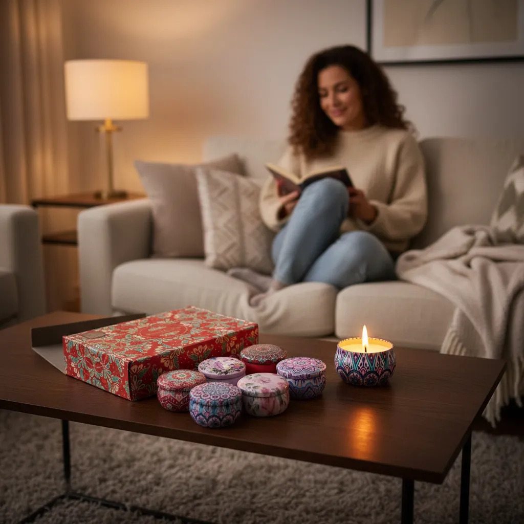 Set de Velas Aromáticas Decorativas en Lata – Caja de Regalo con 6 Fragancias