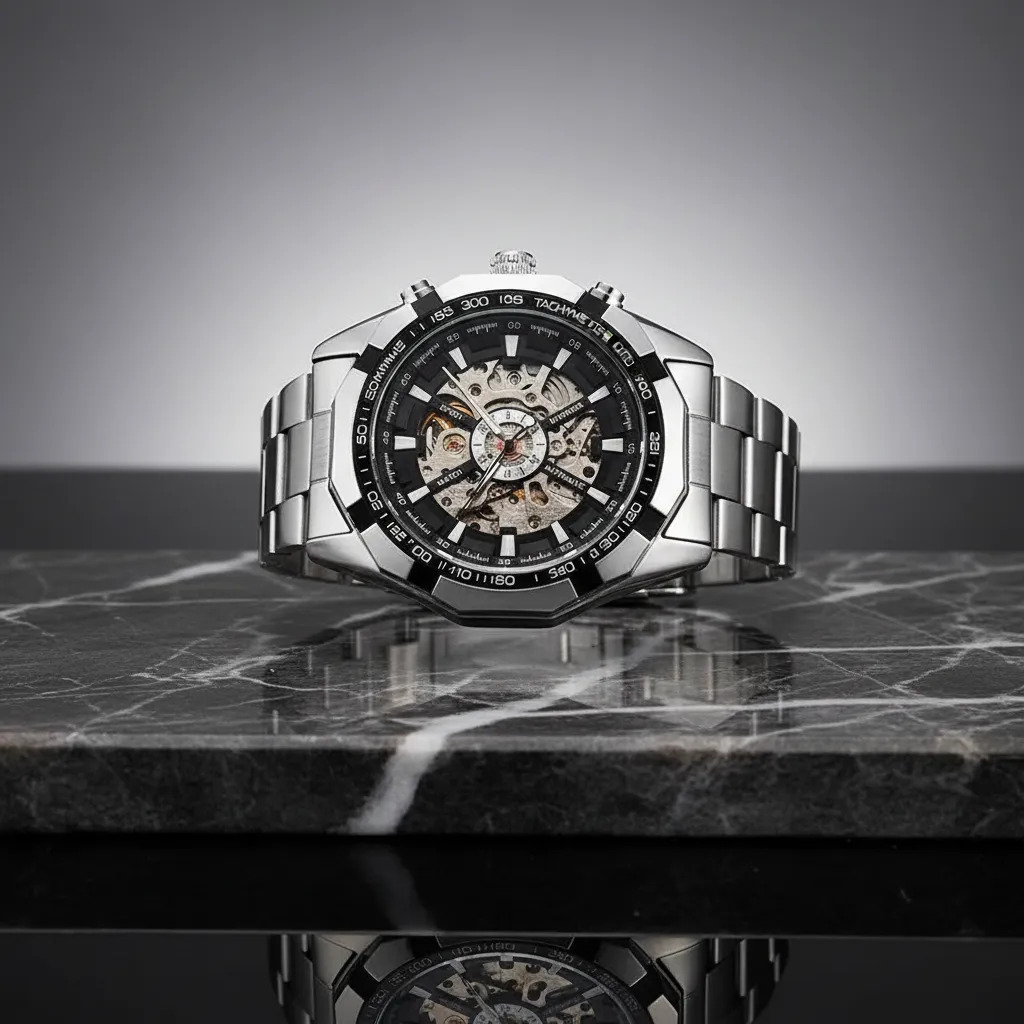Fabricado con acero inoxidable de alta calidad, este reloj combina resistencia, elegancia y un estilo deportivo moderno. Gracias a su movimiento automático, funciona con el movimiento natural de tu muñeca, eliminando la necesidad de baterías.