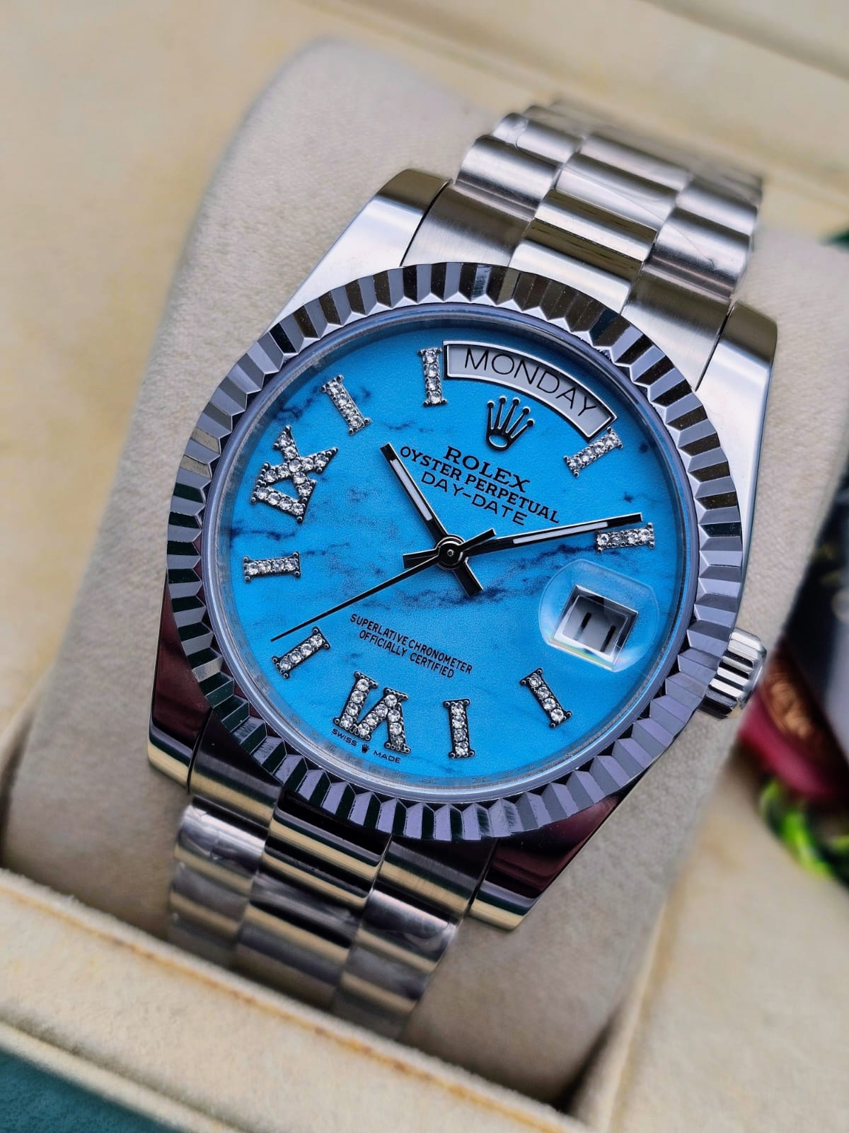 Un modelo icónico y elegante que representa estatus y presencia. Destaca por su impactante carátula turquesa estilo piedra natural, bisel estriado clásico y brazalete tipo President de alto nivel. Una pieza llamativa y exclusiva que no pasa desapercibida.