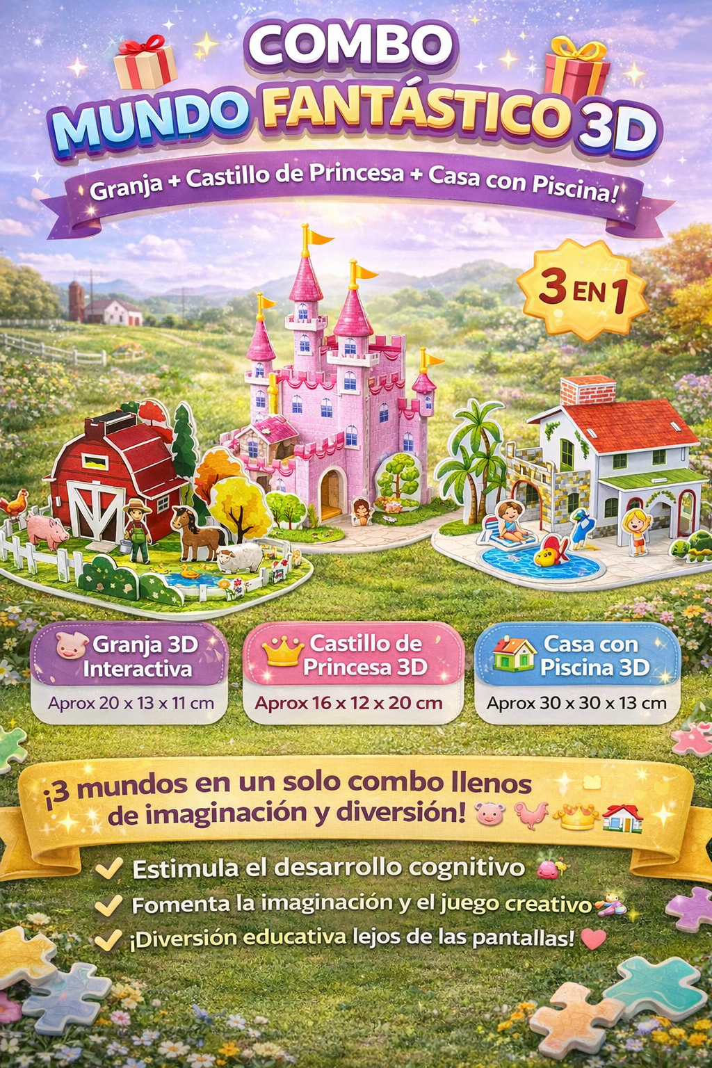 Un combo mágico de 3 rompecabezas 3D que transporta a los niños a tres mundos diferentes llenos de imaginación y diversión.