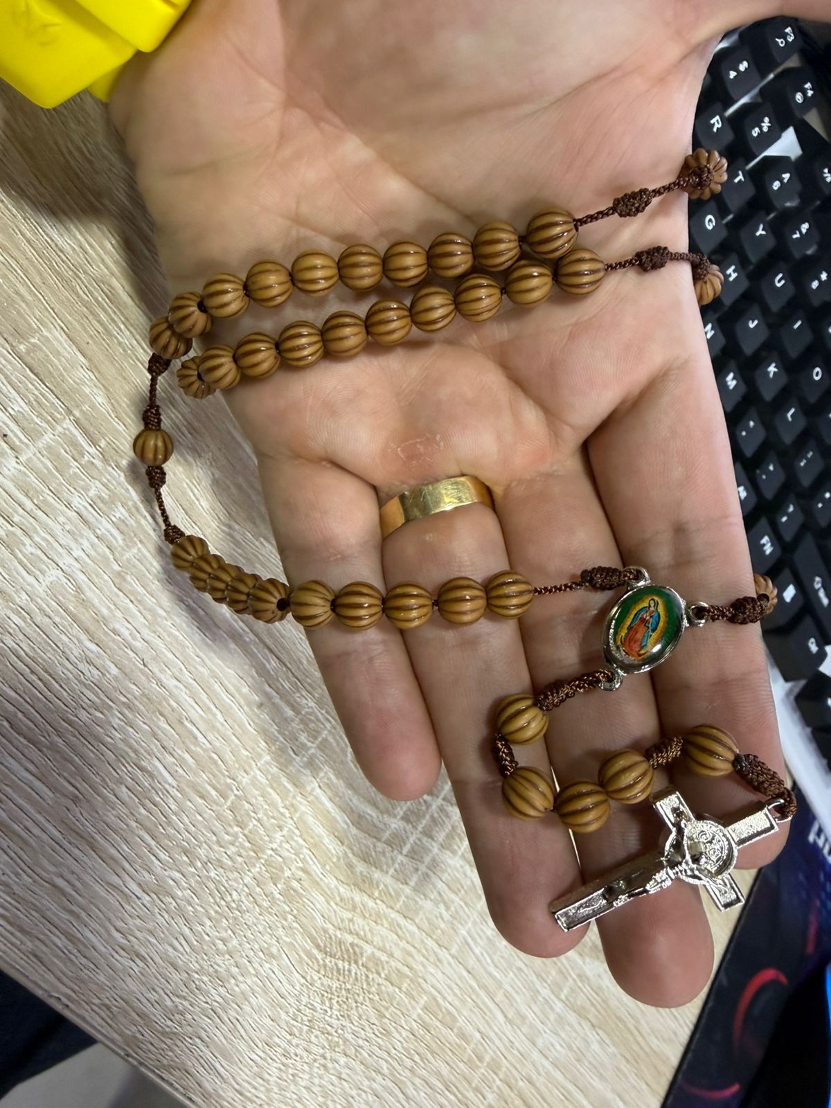 rosario,camandula de la virgen en madera mide en total 43 cm de largo