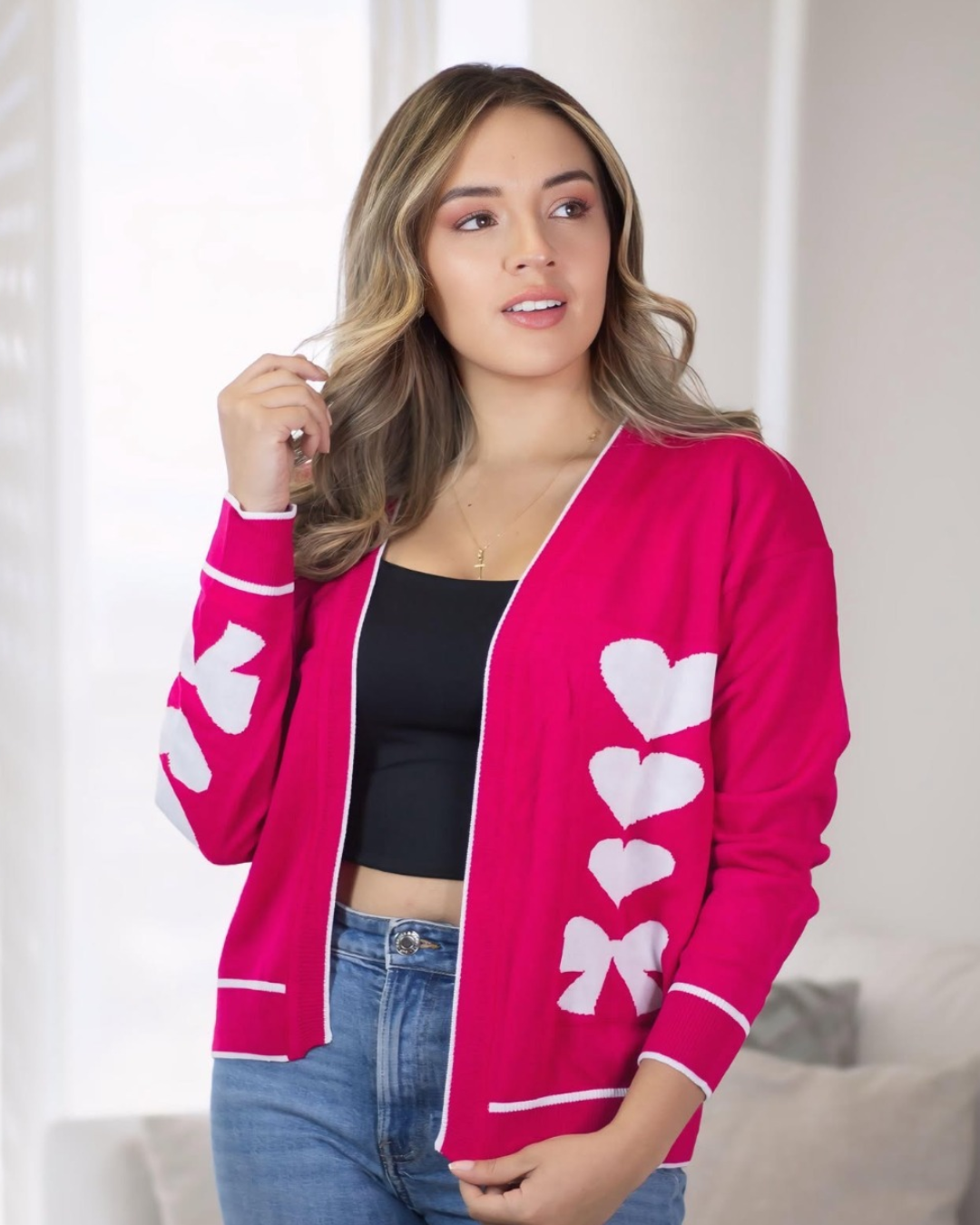 Dale un toque femenino y encantador a tu look con este saco tejido en hilo suave, inspirado en el delicado estilo coquette. Su diseño con corazones y moño aporta un detalle romántico y moderno que eleva cualquier outfit.