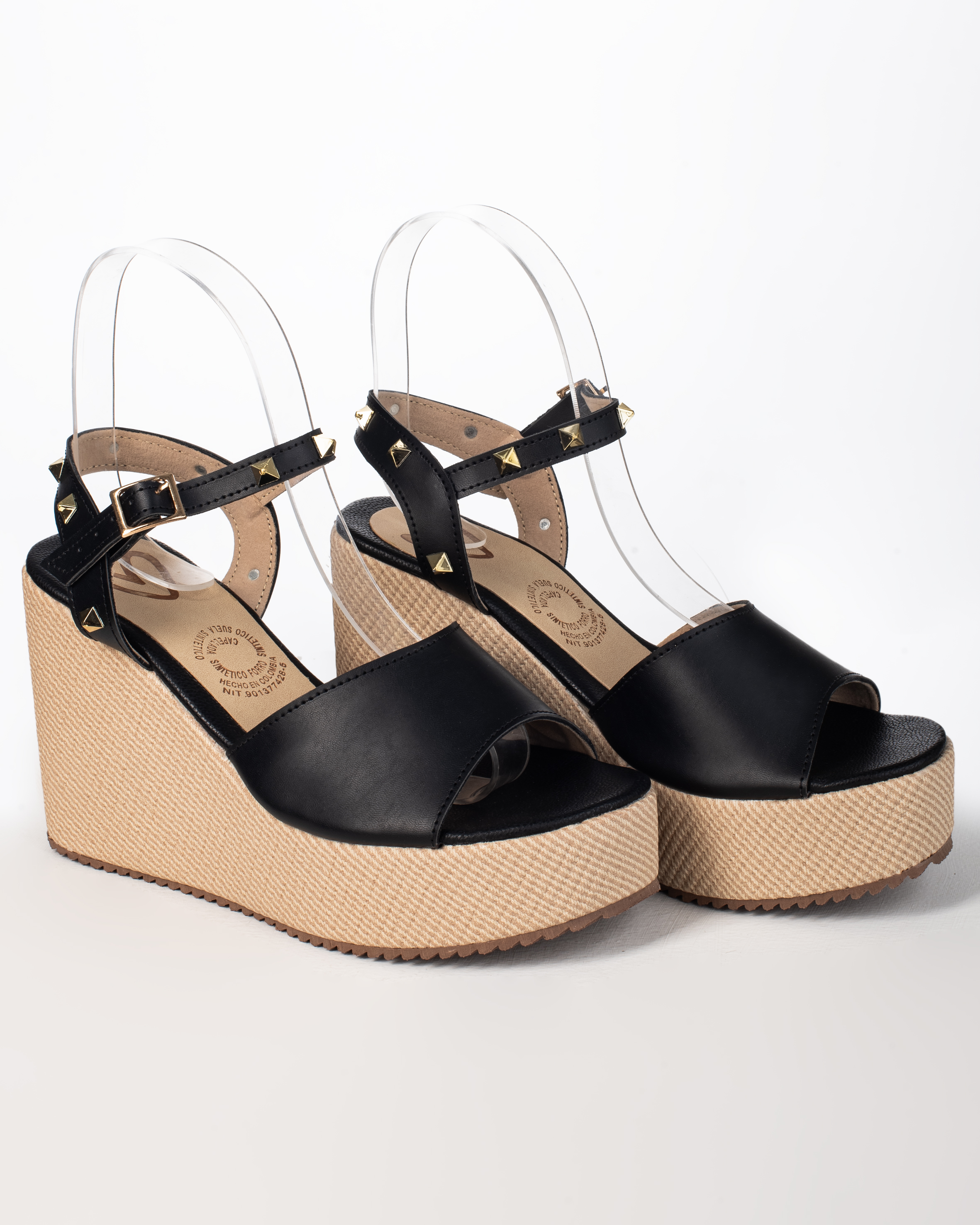 Las A624 son sandalias tipo plataforma con diseño estructurado y detalles metálicos en forma de rombos que aportan carácter y sofisticación. Su silueta limpia al frente se equilibra con una pulsera al tobillo decorada con taches dorados, creando un contraste moderno y elegante.