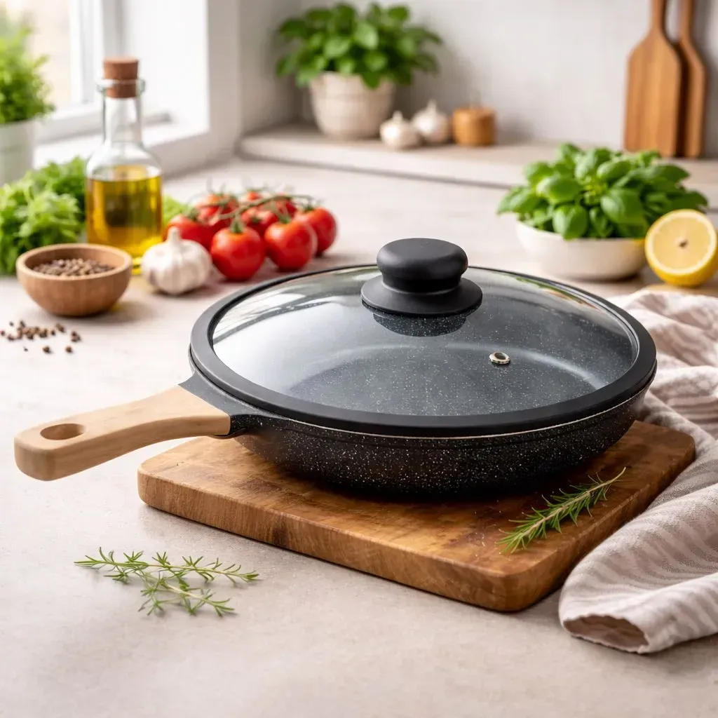 El sartén antiadherente JS 28CM de 28 cm es perfecto para cocinar de manera saludable y práctica. Su recubrimiento tipo piedra evita que los alimentos se peguen y facilita la limpieza. Incluye tapa de vidrio con pomo ergonómico que permite controlar la cocción sin perder calor. El mango de madera brinda un agarre cómodo y seguro, mientras que su diseño moderno lo hace ideal para cocinas domésticas y profesionales.