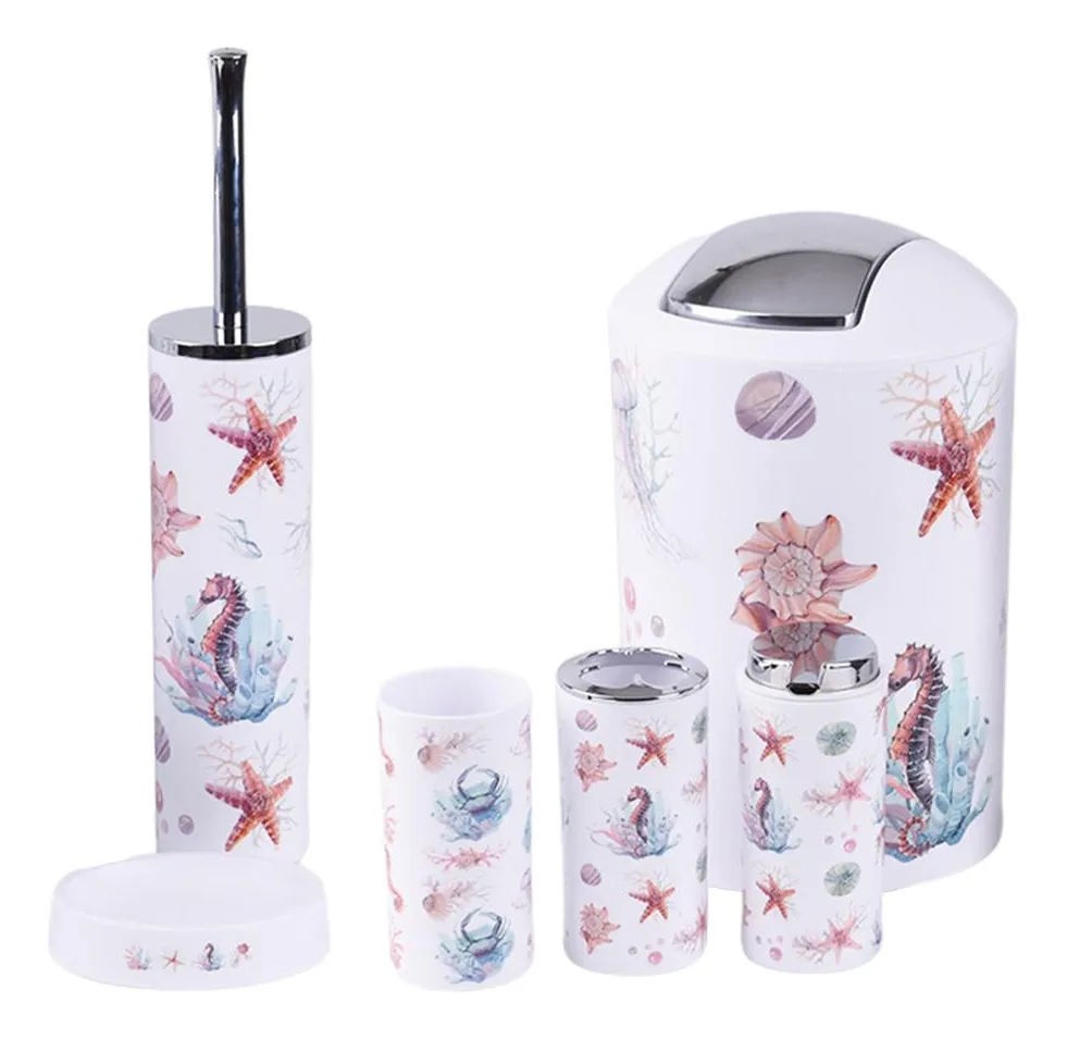 6pcs Jabón de Dispensador de Loción de Dispensador de Cepillo de - Sea Creature Descripción: Set de accesorios para dispensador de baño de 6 piezas de estilo nórdico. El exquisito tejido de plástico en color rosa, con diseño de criatura marina, duradero con total elegancia. Empaquetado con jabonera de 1 pieza, dispensador de loción de 1 pieza, portacepillos de 1 pieza, taza de enjuague bucal de 1 pieza, bote de basura de 1 pieza, 1 juego de cepillo de baño. Conjunto de accesorios decorativos esenciales para el baño, para la renovación de una nueva casa y agregue un toque de lujo a su baño. Regalo perfecto de inauguración de la casa para sus amigos y familiares, también se puede utilizar para hotel y restaurante.