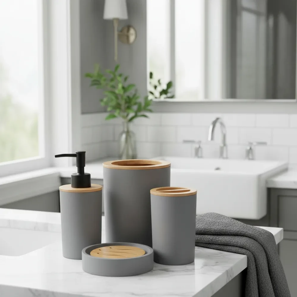 Renueva tu baño con este elegante set de accesorios de baño de 4 piezas, ideal para mantener el orden con un estilo moderno y sofisticado. Su diseño en tono gris combina perfectamente con la tapa tipo bambú, aportando un toque natural y decorativo a cualquier espacio.