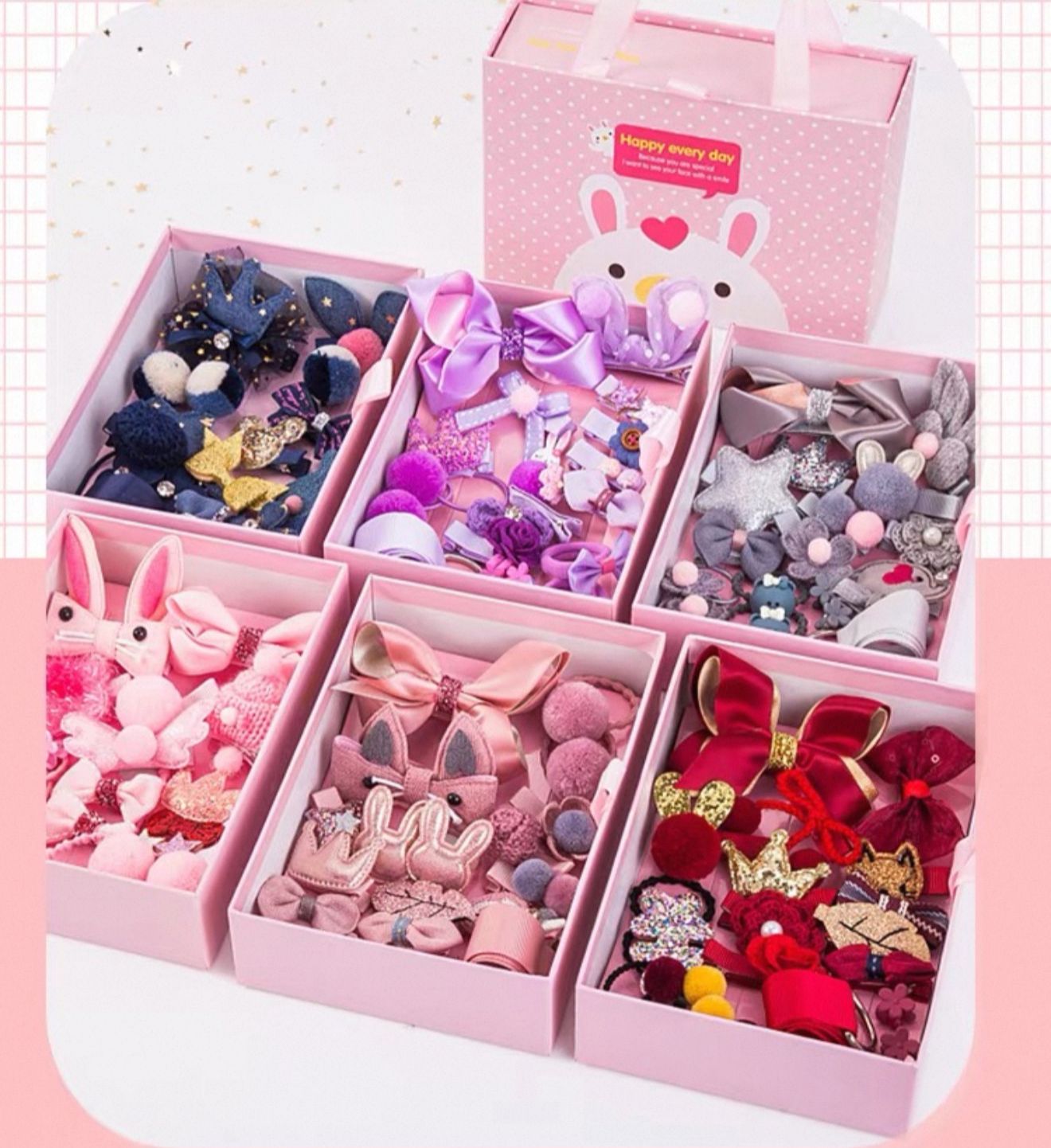 •contienen 14 accesorios entre ellos ganchos y moñas