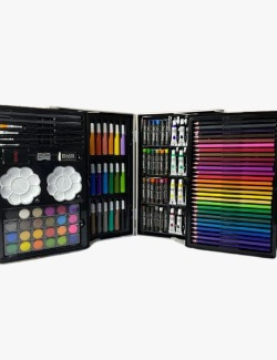 Set de arte infantil presentado en un maletín metálico rígido diseñado para almacenar, proteger y transportar materiales de dibujo y pintura. Cada estuche incluye diferentes herramientas de coloración y manualidades organizadas en compartimentos internos, permitiendo mantener cada pieza en su lugar. La tapa del maletín cuenta con impresiones decorativas de personajes animados, lo que lo convierte en una opción atractiva para actividades escolares, recreativas y creativas.