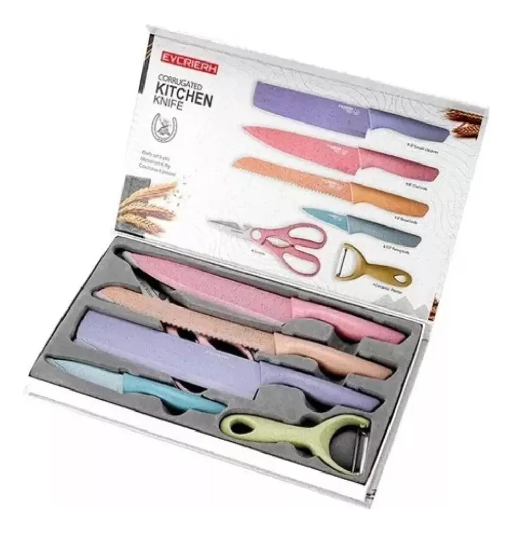 Juego de cuchillos de cocina de acero inoxidable, de colores ondulados, cuchillo de Chef, cuchillo de pan, tijeras de corte y pelador. La hoja de este juego de cuchillos está hecha de acero inoxidable con alto contenido de carbono, su dureza extremadamente alta garantiza una excelente resistencia al hojas se afilan a mano y finalmente se satinan, lo que proporciona un filo magníficamente afilado y eficiente que conservará su nitidez durante períodos prolongados