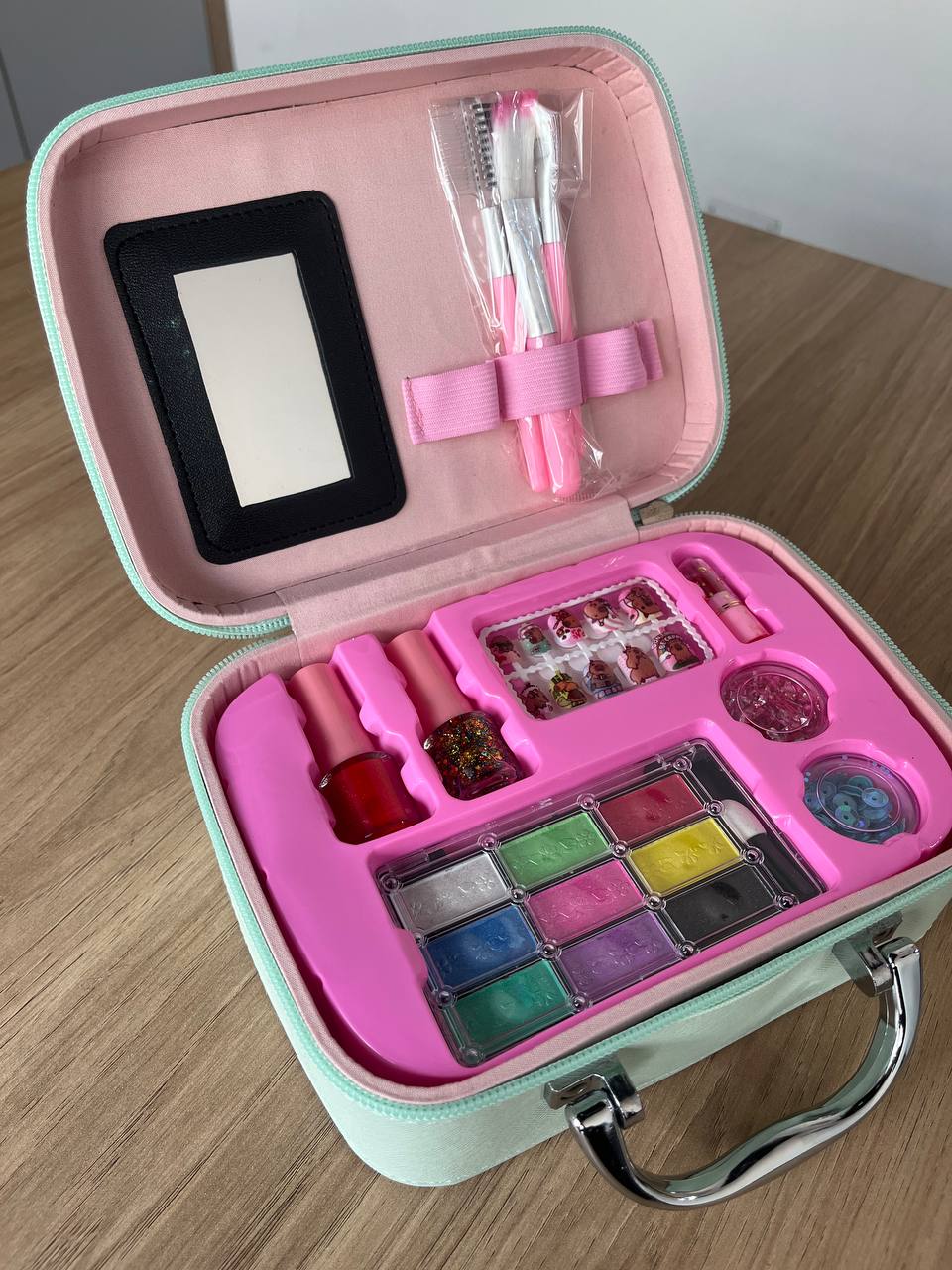 Regala horas de diversión con este encantador set de maquillaje infantil, presentado en un maletín rígido y elegante. Su interior acolchado mantiene todo en orden, mientras que el espejo integrado y las brochas incluidas permiten una experiencia de juego completa, segura y creativa.