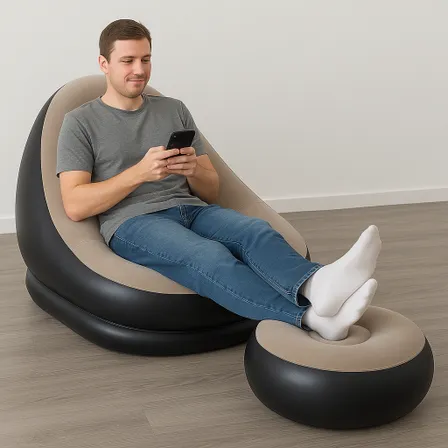 Disfruta de la comodidad en cualquier espacio con el sillón inflable Relax Duo. Incluye reposapiés y respaldo ergonómico, ideal para leer, ver TV o descansar. Compacto, liviano y fácil de inflar. Medidas: 116×83×98 cm. ¡Comodidad portátil a otro nivel!