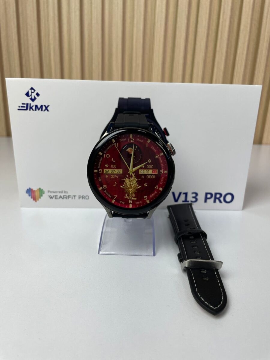 Reloj inteligente V13 Pro de JKMX de diseño circular, orientado al monitoreo de actividad física, control de salud básica y gestión de notificaciones mediante sincronización con smartphone. El dispositivo combina una estética tipo reloj deportivo con una interfaz digital avanzada, integrando sensores corporales y funciones inteligentes para uso diario continuo.